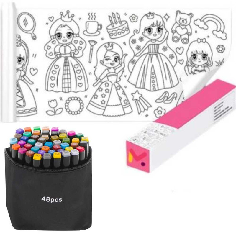 Set creativ cu rola hartie autoadeziva model printese si set 48 markere cu alcool cu doua capete