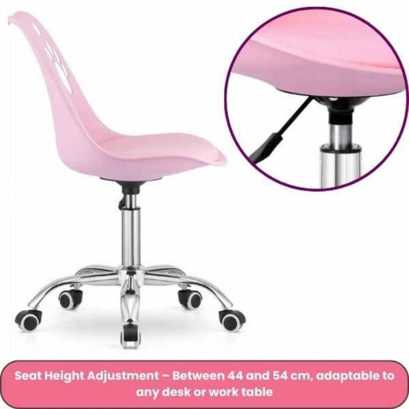 Mobilitatea este asigurata prin rotire 360 si 5 roti cauciucate silentioase, protejand podelele delicate. Reglajul pe inaltime intre 79 si 89 cm se adapteaza pentru utilizatori diferiti, iar cromatica roz total aduce energie si stil feminin spatiului de lucru.