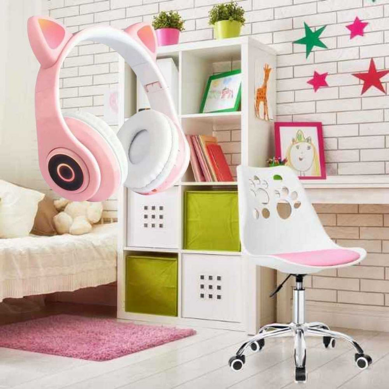 Acest pachet reuneste scaunul de birou ergonomic roz cu casti wireless cu urechi pisica, oferind un echilibru perfect intre confort la lucru si experienta audio moderna.