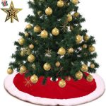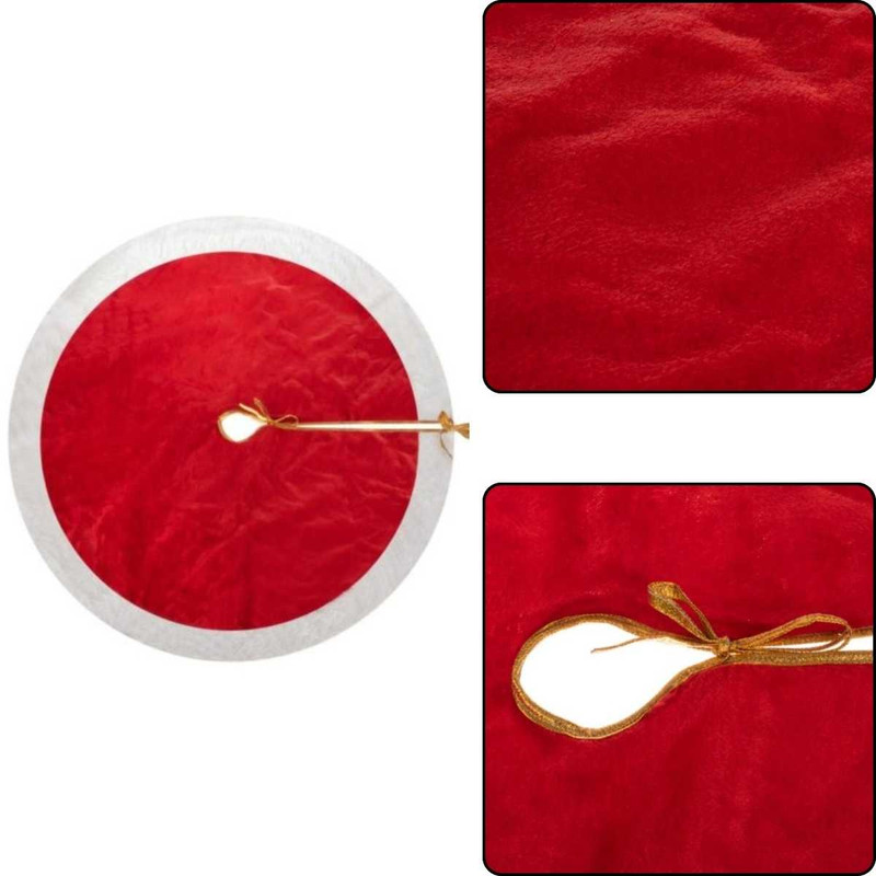 Covorasul din poliester moale, diametru 90 cm, protejeaza podeaua si ordoneaza zona bradului. Combinatia rosu cu alb si marginea aurie aduc un efect vizual cald, potrivit oricarui stil de interior.